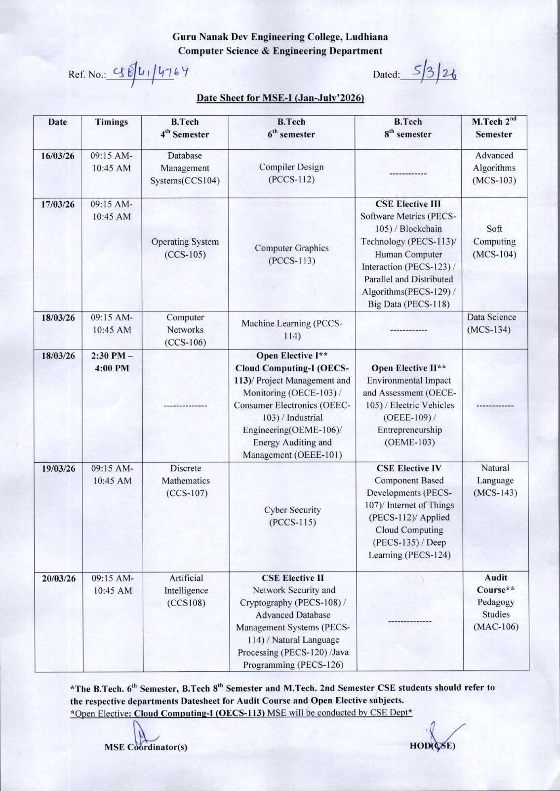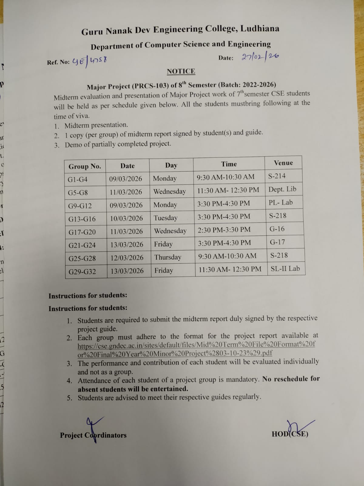 • Mid Term Evaluation and Presentation of Major Project for 8th Sem Students (Jan-June 2026)
